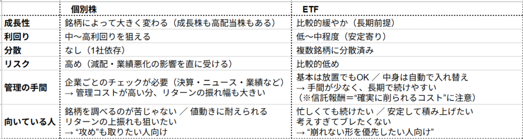 【個別株とETFの特徴(もう一歩深く)】